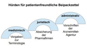 Den Bemühungen um verständliche Beipackzettel stehen also gleich mehrere Hürden entgegen: die Fachbegriffe müssen den medizinischen Definitionen entsprechen, die Texte sollen juristisch abgesichert sein und zugleich den administrativen Vorgaben aus Brüssel folgen.