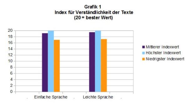 Unser Test zeigt (Grafik 1 + Anlage), dass die Indexwerte für Einfache und Leichte Sprache dicht beieinander liegen: Die Mittelwerte betragen 18 (ES) bzw. 18,5 (LS); die Werte der einzelnen Texte reichen in beiden Fällen (ES/LS) von 17 bis 20.