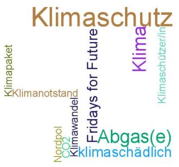 Einige Hauptbegriffe tauchen in beiden Wolken auf (Klimaschutz, Fridays for Future, Klimawandel, Klimapaket). In der Einfachen oder Leichten Sprache sind die Begriffe jedoch besser lesbar: zusammengesetzte Wörter erscheinen  mit Bindestrich oder Mediopunkt. Zudem sind die verwendeten Begriffe häufig allgemeiner Art (Klima, klimaschädlich) und auf konkretes Geschehen bezogen (Klimaschützerin, CO2, Abgase, Nordpol). Die Texte der Standardsprache hingegen überbieten sich mit speziellen Begriffen vor allem zur Klimapolitik.