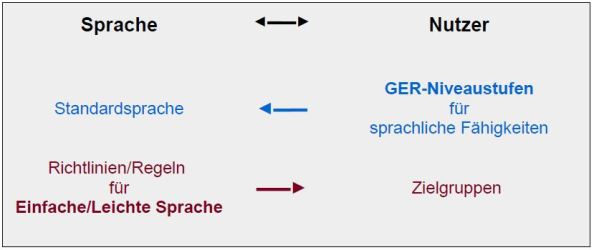 Unten sind noch einmal die Herangehensweisen bei den GER-Niveaustufen und bei Einfacher/Leichter Sprache gegenübergestellt. Beide vermitteln zwar zwischen Sprache und Nutzer, doch in Ausgangspunkt und Ziel stimmen sie nicht überein. Zudem ist Einfache/Leichte Sprache hauptsächlich für Texte in der Muttersprache gedacht, während die GER-Niveaustufen auf Kenntnisse in Fremdsprachen gerichtet sind (vgl. dazu Andreas Baumert, 2018, S. viii )