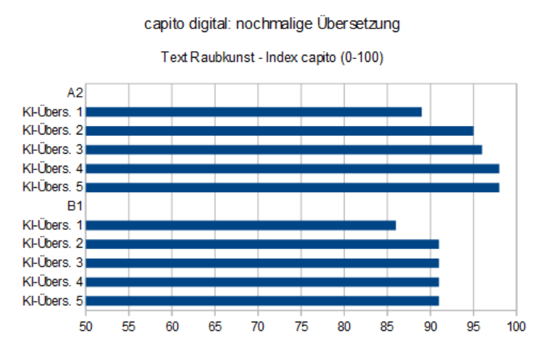 - Bei capito digital erreichen die KI-Übersetzungen einen hohen Wert – im Gegensatz zum HIX-Werten. Das könnte damit zusammenhängen, dass die Kriterien der Wortlänge, Satzlänge und Satzstruktur im capito-Index und auch in den Vorschlägen zur Vereinfachung geringer gewichtet sind.