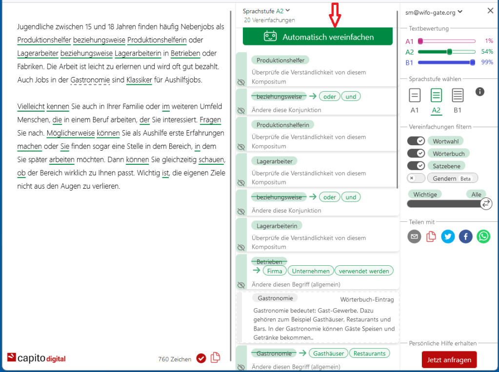 Man kann eine KI-Übersetzung verbessern, indem man sie nochmals vereinfacht. Das ist sinnvoll, wenn der Text weitgehend erhalten bleibt und nur punktuell vereinfacht wird. Hierfür eignet sich die automatische Vereinfachung von capito digital, da sie von internen Sprachkriterien geleitet wird.