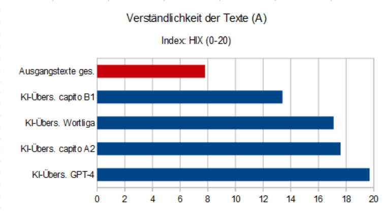 Maßgeblich für höhere HIX-Werte sind kurze Wörter und kurze, einfach strukturierte Sätze. Die Übersetzungen von Wortliga und GPT-4 haben weniger lange Wörter als capito digital. Von allen hat GPT-4 die wenigsten langen Sätze. Letzteres mag der oben zitierte Prompt bewirken, der kurze Sätze fordert.