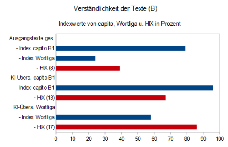 Schon bei den Ausgangstexten ist erkennbar, dass der Indexwert von capito höher als der HIX-Wert ist, während der Indexwert von Wortliga unter dem HIX-Wert liegt. Diese Unterschiede zum HIX-Wert zeigen sich auch bei den Übersetzungen:
