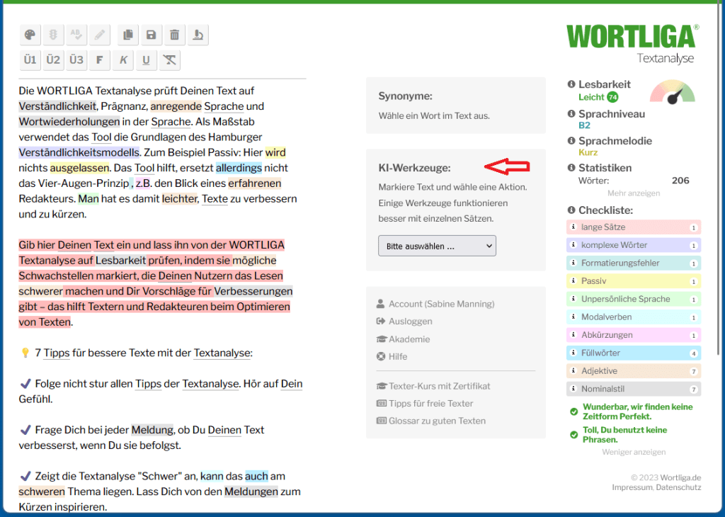 Wortliga -> KI-Werkzeuge: zur Auswahl gehört „Vereinfachen“
