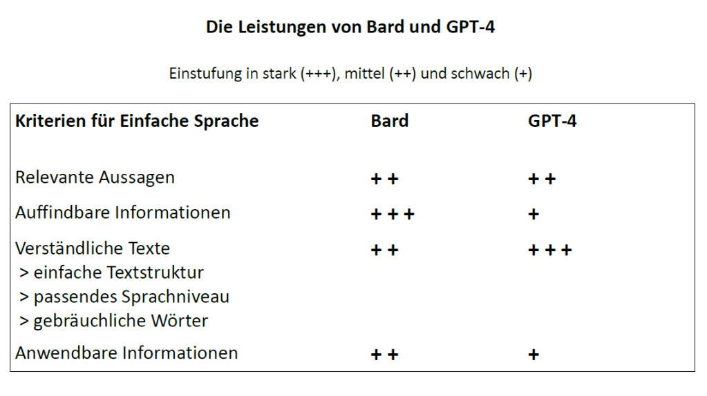 Beide KI-Programme verwandeln die wenig verständlichen Ausgangstexte in Einfache Sprache. Dabei sind die Übersetzungen von GPT-4 leichter verständlich als die von Bard. Das erreicht GPT-4 vor allem mit weniger langen Sätzen (über 15 Wörter) und auch mit weniger langen Wörtern (über 16 Buchstaben). Komplexe Sätze (mit mehr als 2 Satzteilen) sind allerdings häufiger bei GPT-4 anzutreffen.
