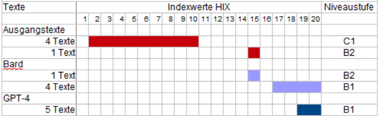 Vor diesem Hintergrund haben wir die KI-Übersetzungen auf ihr Sprachniveau getestet. Hier sind die ermittelten Niveaustufen von Wortliga im Vergleich zu den HIX-Werten:
