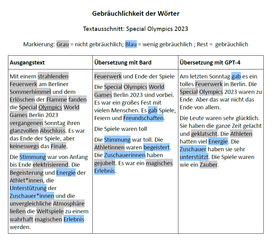 In diesen Grundsätzen steht die Leserschaft im Mittelpunkt. Auf sie ist die Einfache Sprache ausgerichtet. Das gilt zwar vor allem für neu verfasste Texte. Doch auch Übersetzungen sollten sich der Leserschaft so weit zuwenden, wie es der Ausgangstext ermöglicht. Nachfolgend werden wir prüfen, wieweit die Übersetzungen von Bard und GPT-4 die Grundsätze der Einfachen Sprache erfüllen.