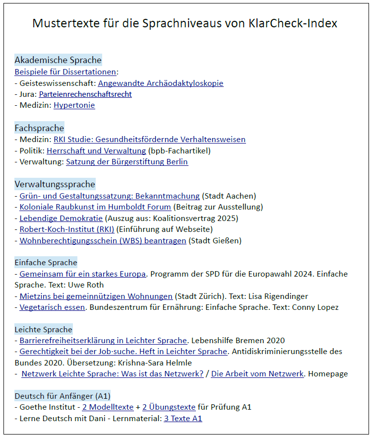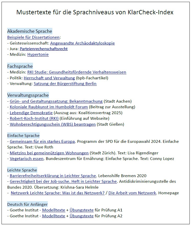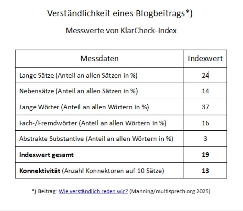 Zusätzlich stellen wir jetzt ein Tool vor, das einen Index der Verständlichkeit für beliebige Texte berechnen kann: KlarCheck-Index (klarcheck-index.org).