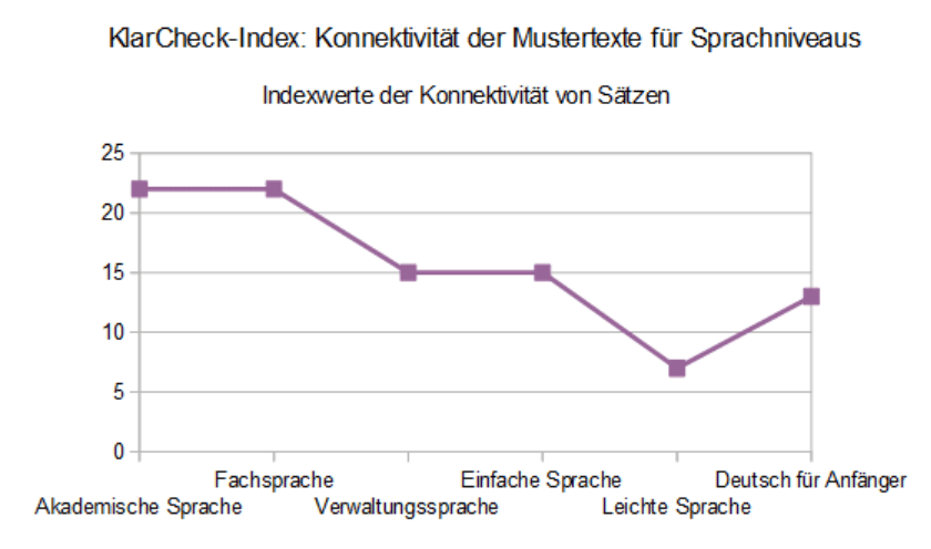 In der Grafik unterscheiden sich die Sprachniveaus hinsichtlich ihrer Konnektivität. Wie zu erwarten, haben akademische und fachliche Texte eine besonders hohe Konnektivität. Demgegenüber hat die Leichte Sprache die niedrigste Konnektivität. Typisch für deren Texte sind wenig verbundene kurze Hauptsätze. Überraschend ist der Indexwert von Deutsch für Anfänger: Obwohl dieses Sprachniveau auf sehr einfache Sätze und Wörter angewiesen ist, erreicht es eine Konnektivität auf dem Niveau der Einfachen Sprache. Wie diese entspricht Deutsch für Anfänger den Kriterien der Standardsprache.