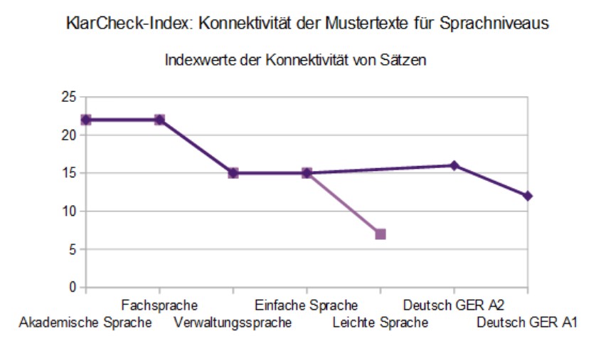 In der Grafik unterscheiden sich die Sprachniveaus hinsichtlich ihrer Konnektivität. Wie zu erwarten, haben akademische und fachliche Texte eine besonders hohe Konnektivität. Demgegenüber hat die Leichte Sprache die niedrigste Konnektivität. Typisch für deren Texte sind wenig verbundene kurze Hauptsätze.